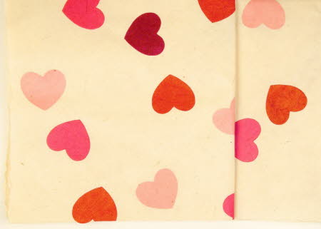 Scattered pink, red and crimson lokta hearts each approximately 5 cm in width, appliquéd to a sheet of natural lokta paper, make an unusual and attractive gift wrap paper for your valentine’s presents. The sheets are medium-weight 30 inches by 20 inches - 100 gsm natural lokta paper, produced and dyed in villages in Nepal.