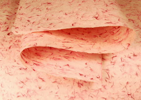 Lokta fibres dyed with raspberry/cranberry red swirl against a rosy pink background, like eddies of water at the foot of waterfalls or fallen rose petals, on this medium-weight 30 inches by 20 inches - 55 gsm paper (pack of 3 sheets).